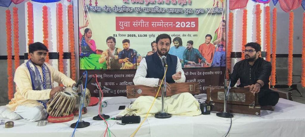 आरा। डॉ. जया जैन शैक्षणिक एवं सामाजिक कल्याण ट्रस्ट द्वारा स्वर्गीय सनमत कुमार जैन की स्मृति में आयोजित युवा संगीत सम्मेलन में शास्त्रीय संगीत, गायन एवं नृत्य की उत्कृष्ट प्रस्तुतियों ने श्रोताओं को मंत्रमुग्ध कर दिया। यह आयोजन आरा के जेल रोड स्थित मैना सुंदर धर्मशाला में संपन्न हुआ।